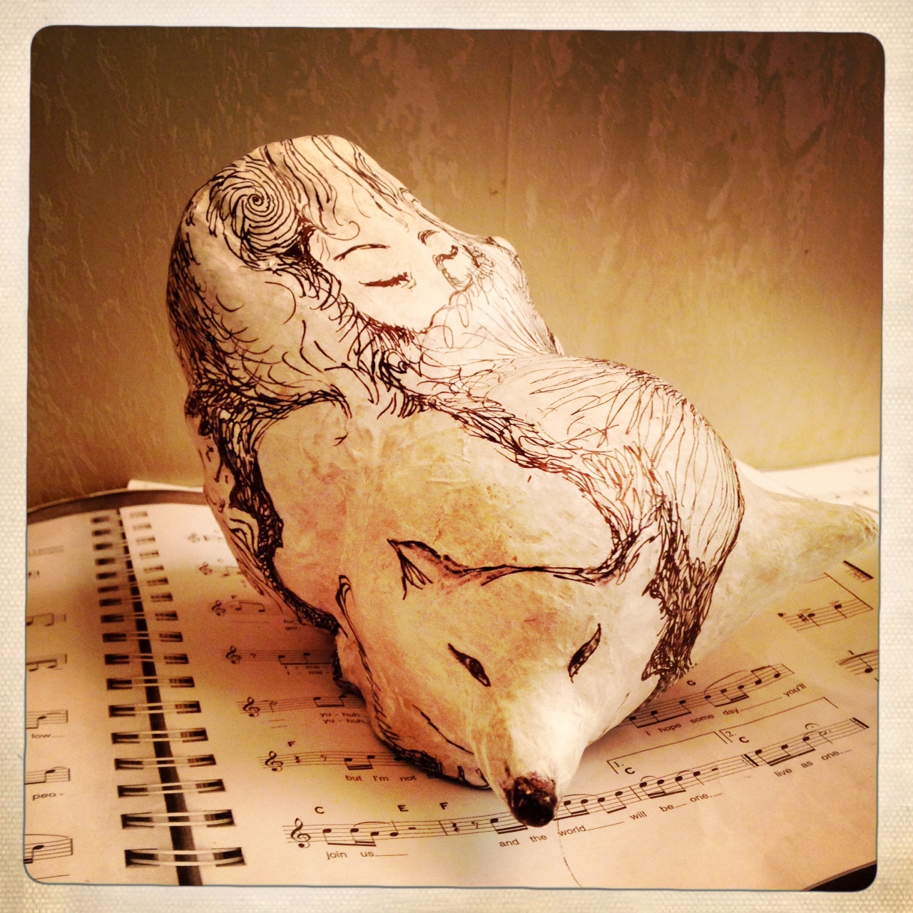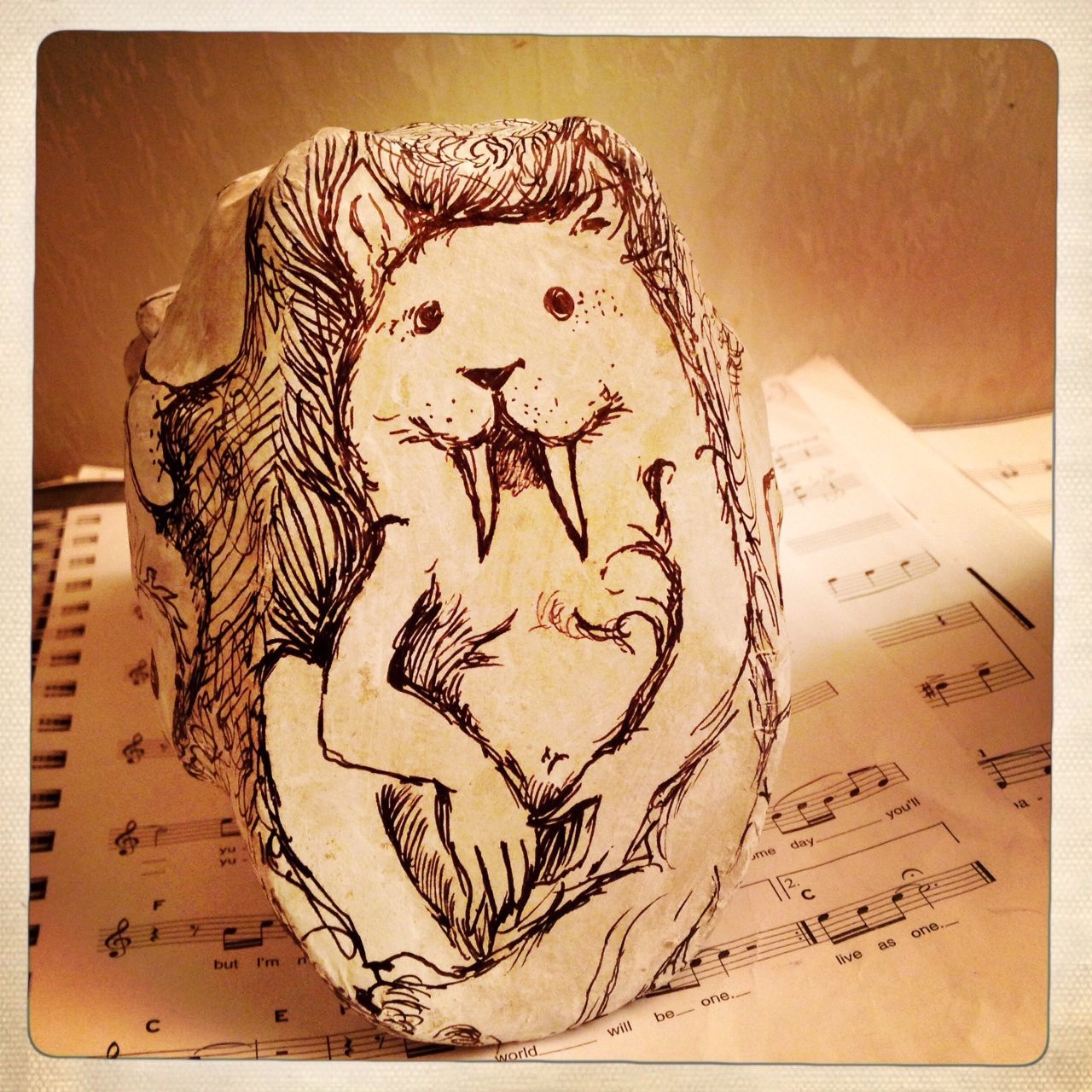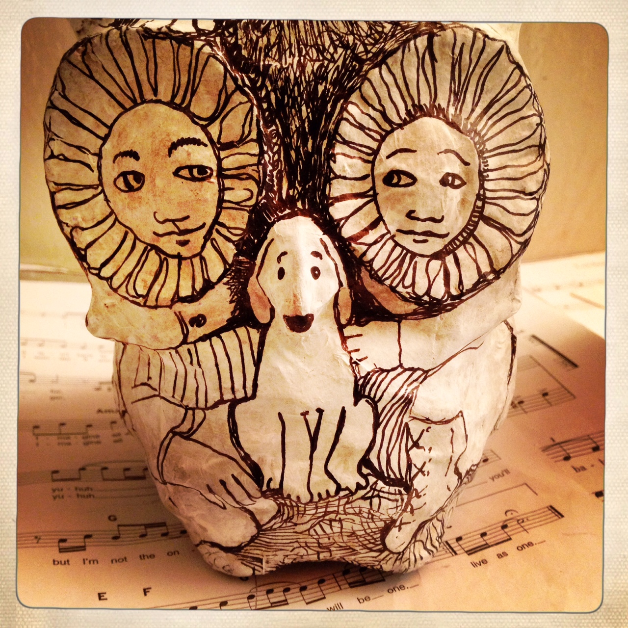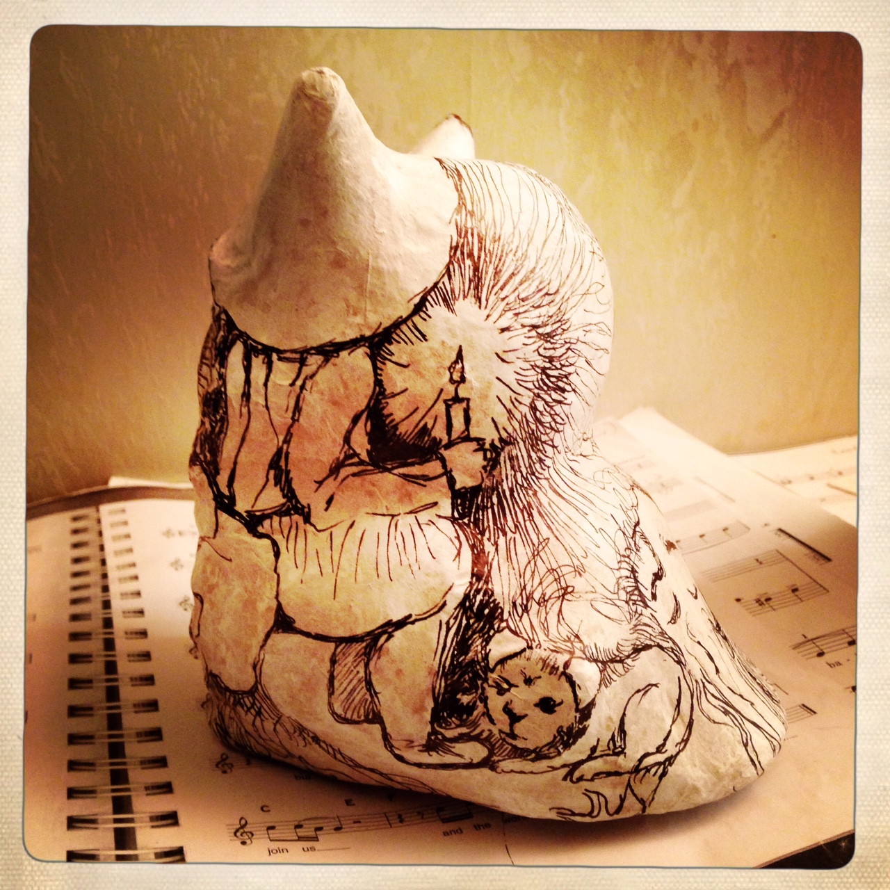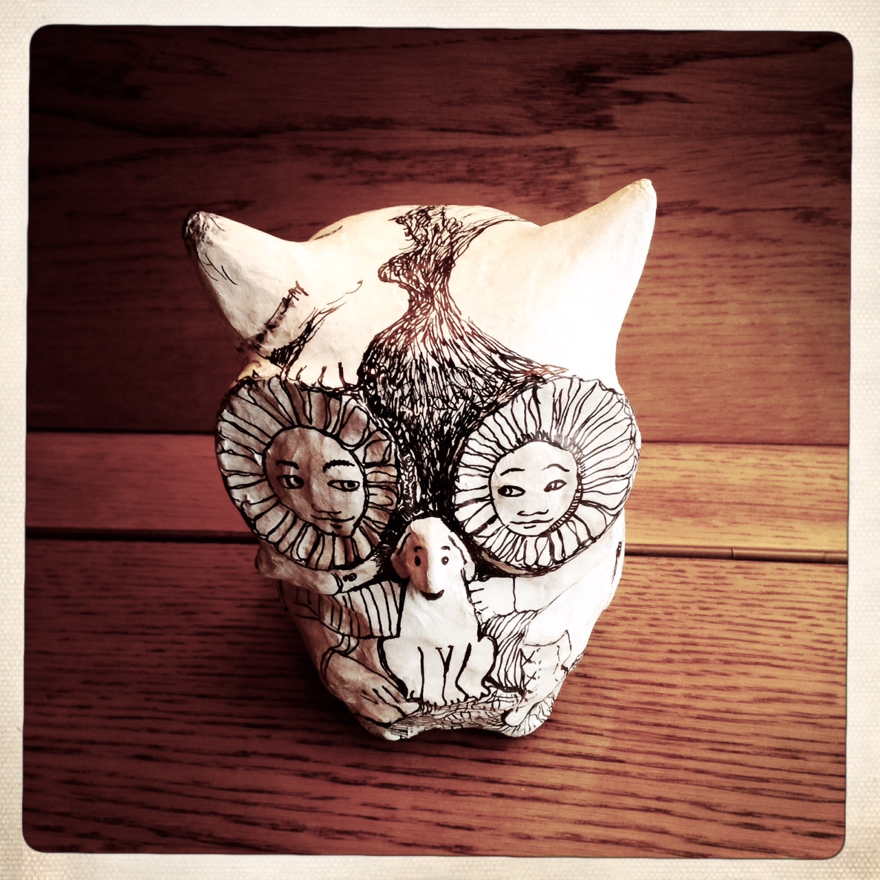 sur une chouette en papier mâché trouvée au rayon bricolage… joli prétexte pour inventer des histoires…