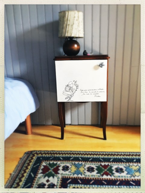 juste à côté du lit cette petite table de nuit avait été parée autrefois d’un système de protection avec fermeture renforcée contre de petits doigts aventureux … les doigts ont grandi … la drôle de porte avait envie d’une nouvelle histoire …