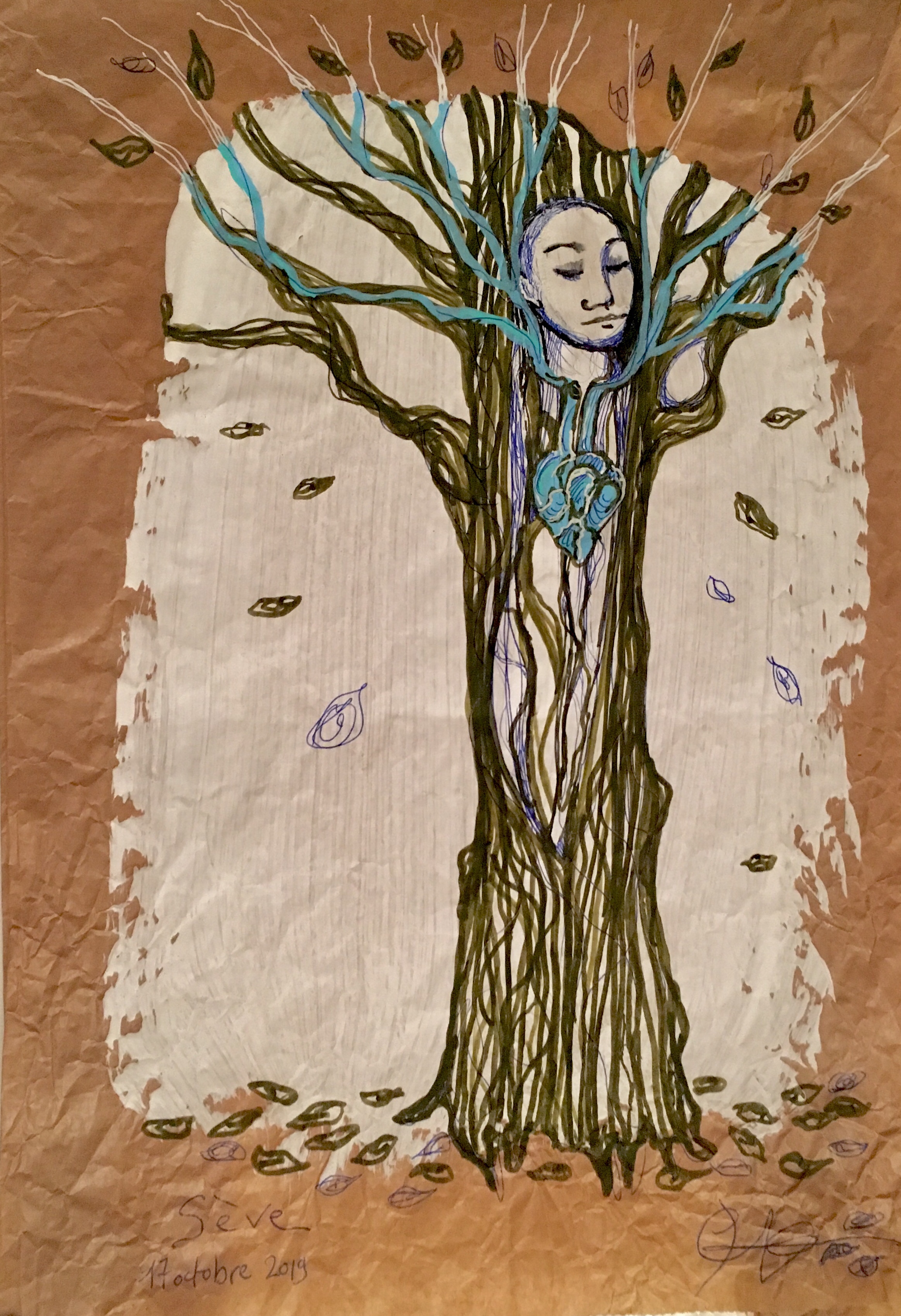 apparition à l’arbre … acrylique et stylo sur sachet de boulangerie