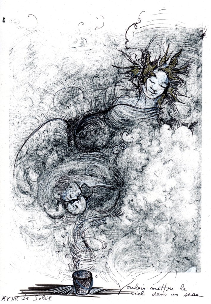 dessin improvisé à partir d’un idéogramme, d’un mot symbolique et d’une carte tirés au hasard…