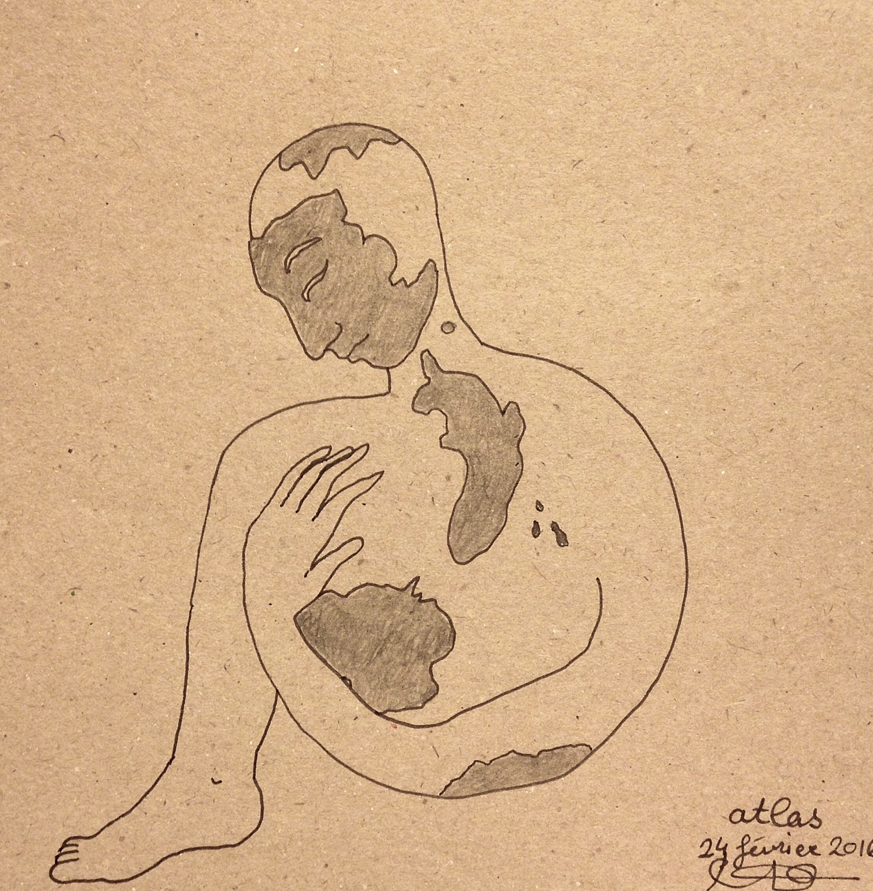 dessiné dans le tgv en rentrant de Bourgogne ce soir… je suis Atlas… de plus en plus conscient de ce monde et de ses contours, de tous les habitants qui le peuplent… et de son poids…