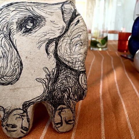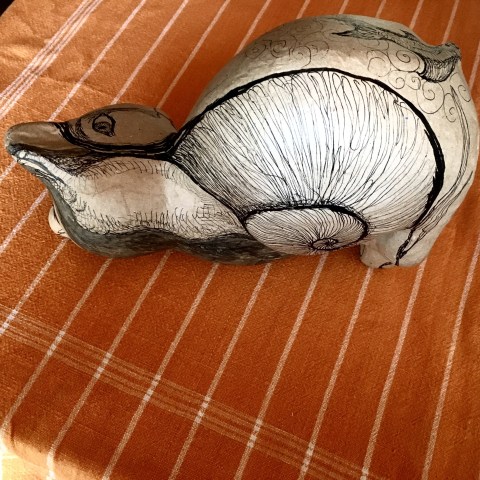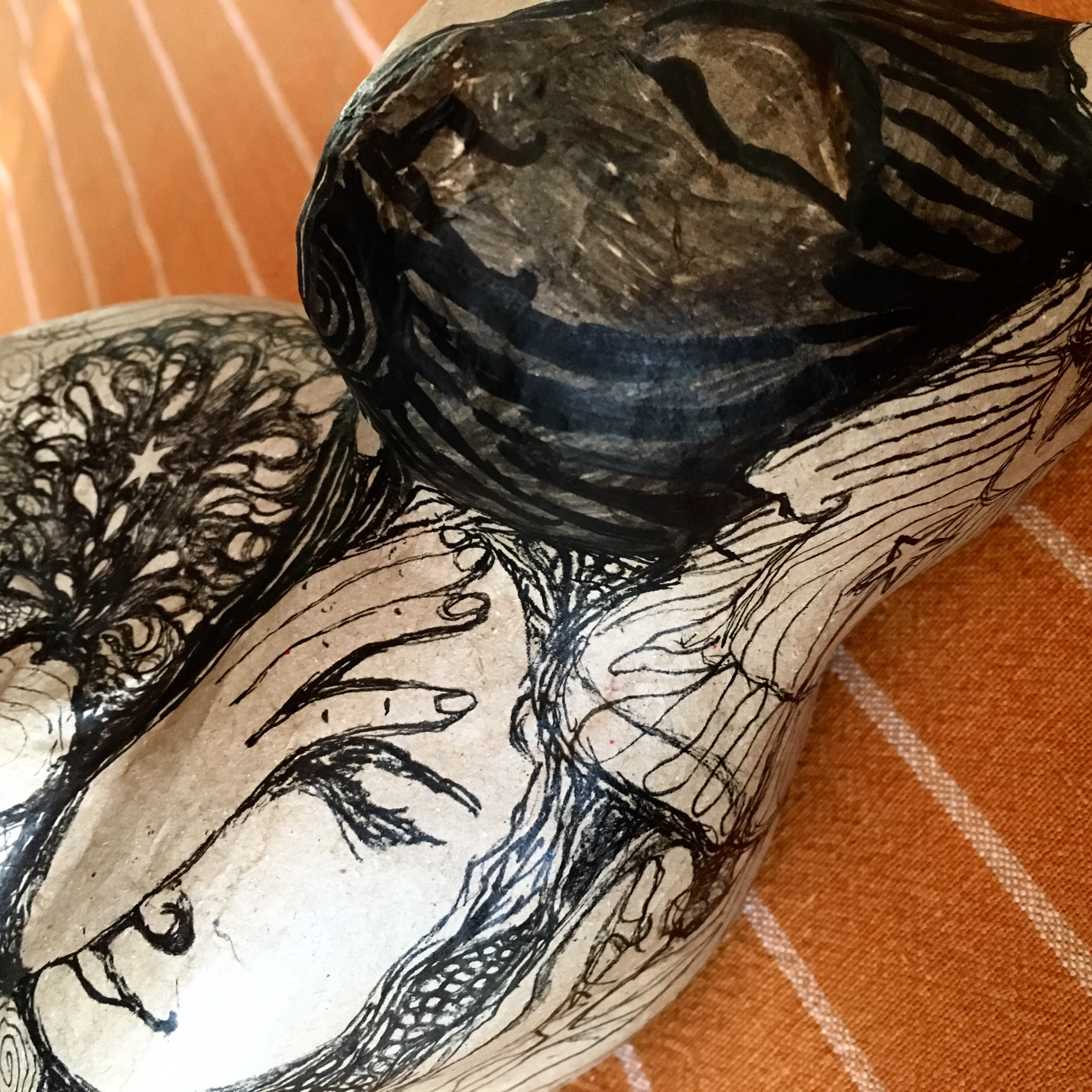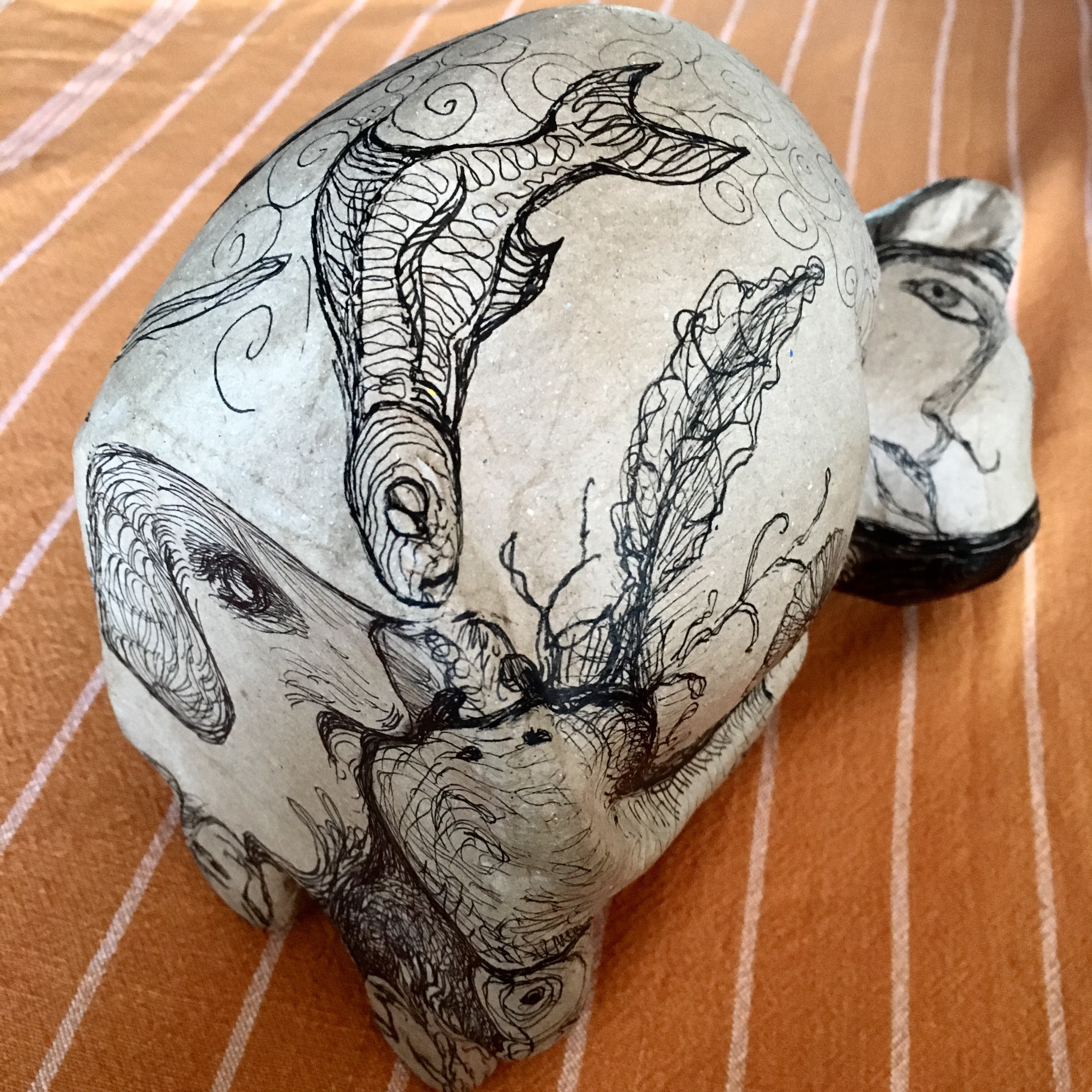 travail en cours depuis plusieurs mois : dessin sur formes préfabriquées de papier mâché … le déjà prêt à décorer, comme le prêt à manger, le prêt à porter, le prêt à penser, ne nous laisse que peu de marge à rêver … à penser autrement …